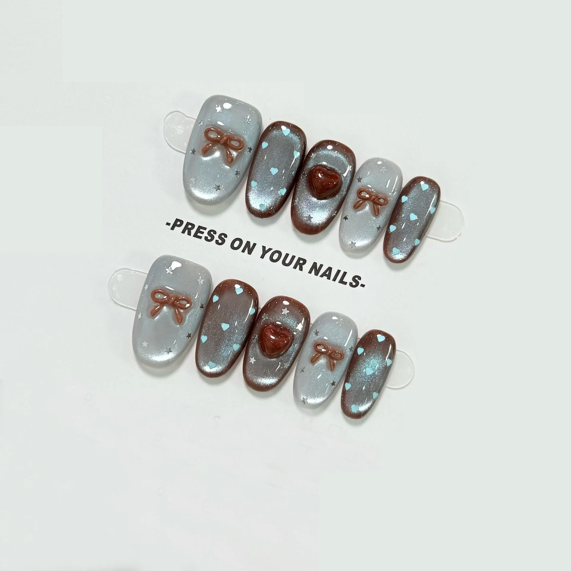 10pcs Medium Oval Handmade Nails Autumn/Winter Blue-Brown Cat Eye Press on Nail for Women&Girl Heart Bow Removable Wearable Nail