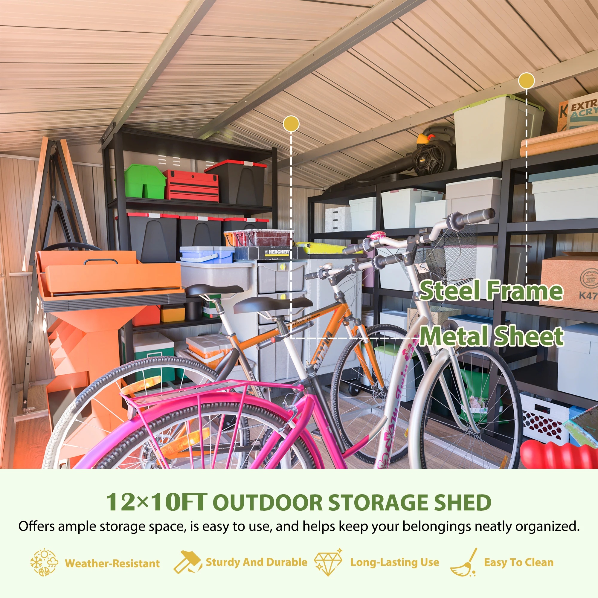 Tackle clutter and reclaim your outdoor space with this heavy-duty 12x10FT Grey Metal Storage Shed. Built from galvanized steel panels with a rust-resistant coating, this shed delivers long-lasting protection against wind, rain, and UV exposure.