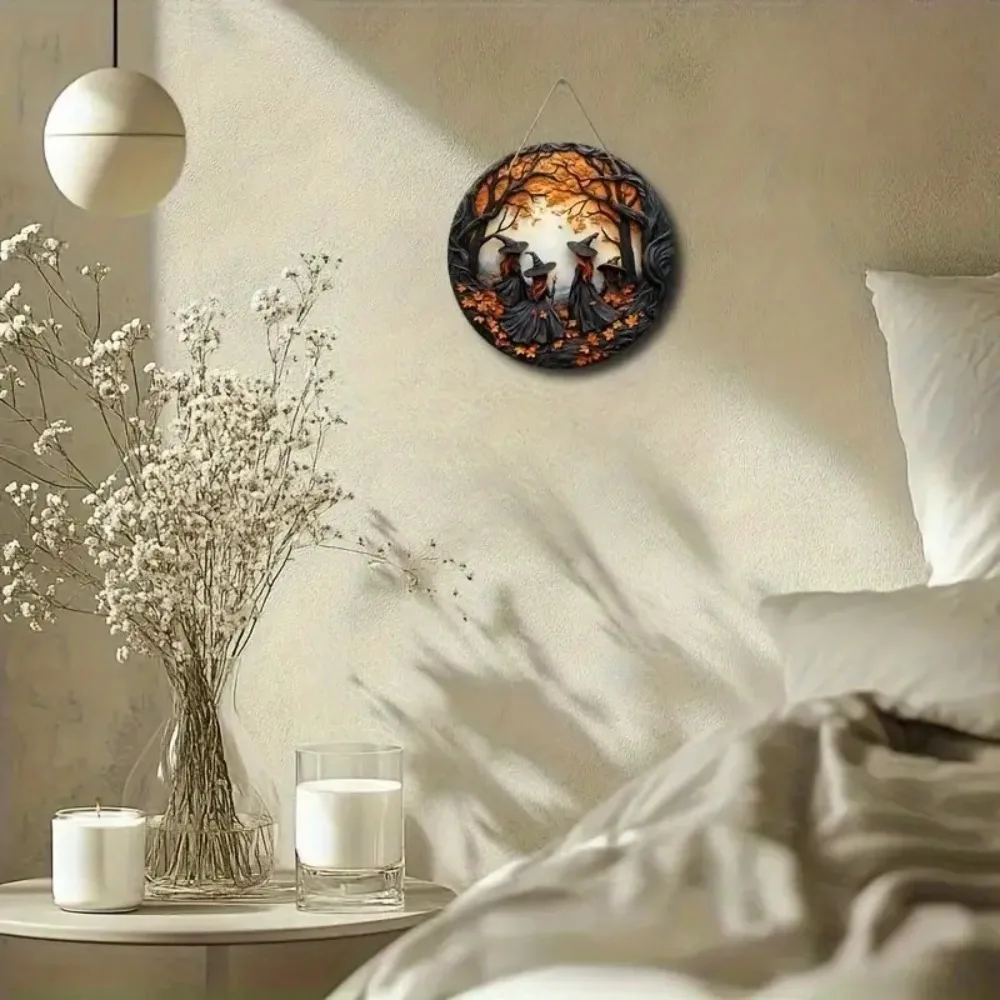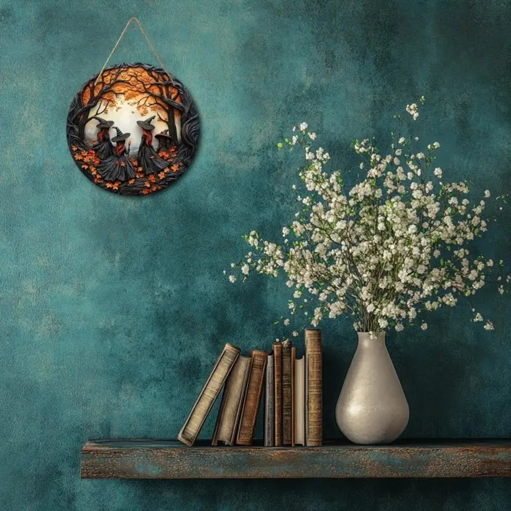 2D Retro Halloween Witch Circular Wooden Sign, Suitable for Home, Restaurant, Office, Coffee Shop, Bar, Holiday Decoration Gifts