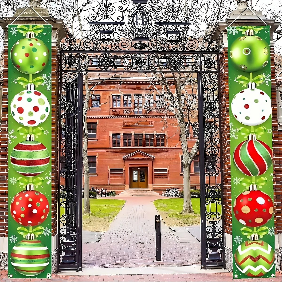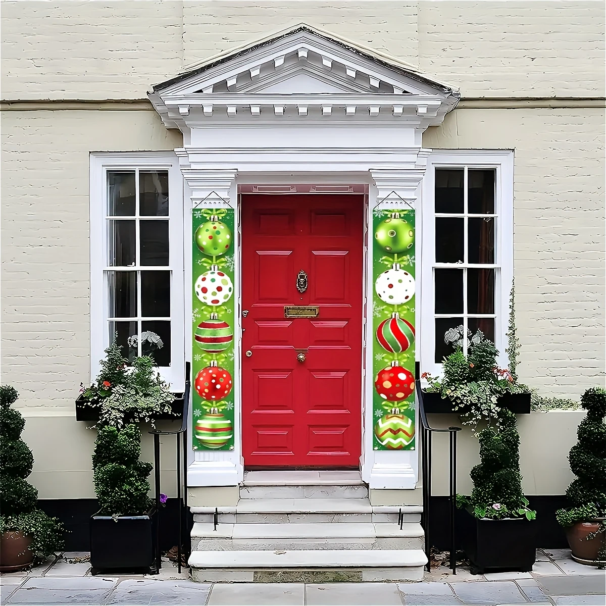 Red and green holiday decorations, featuring ornaments, snowflakes and the words "Merry Christmas"