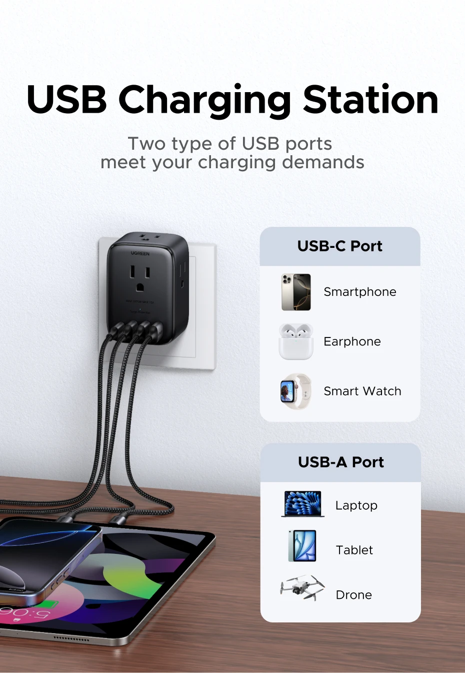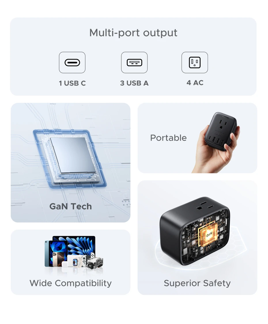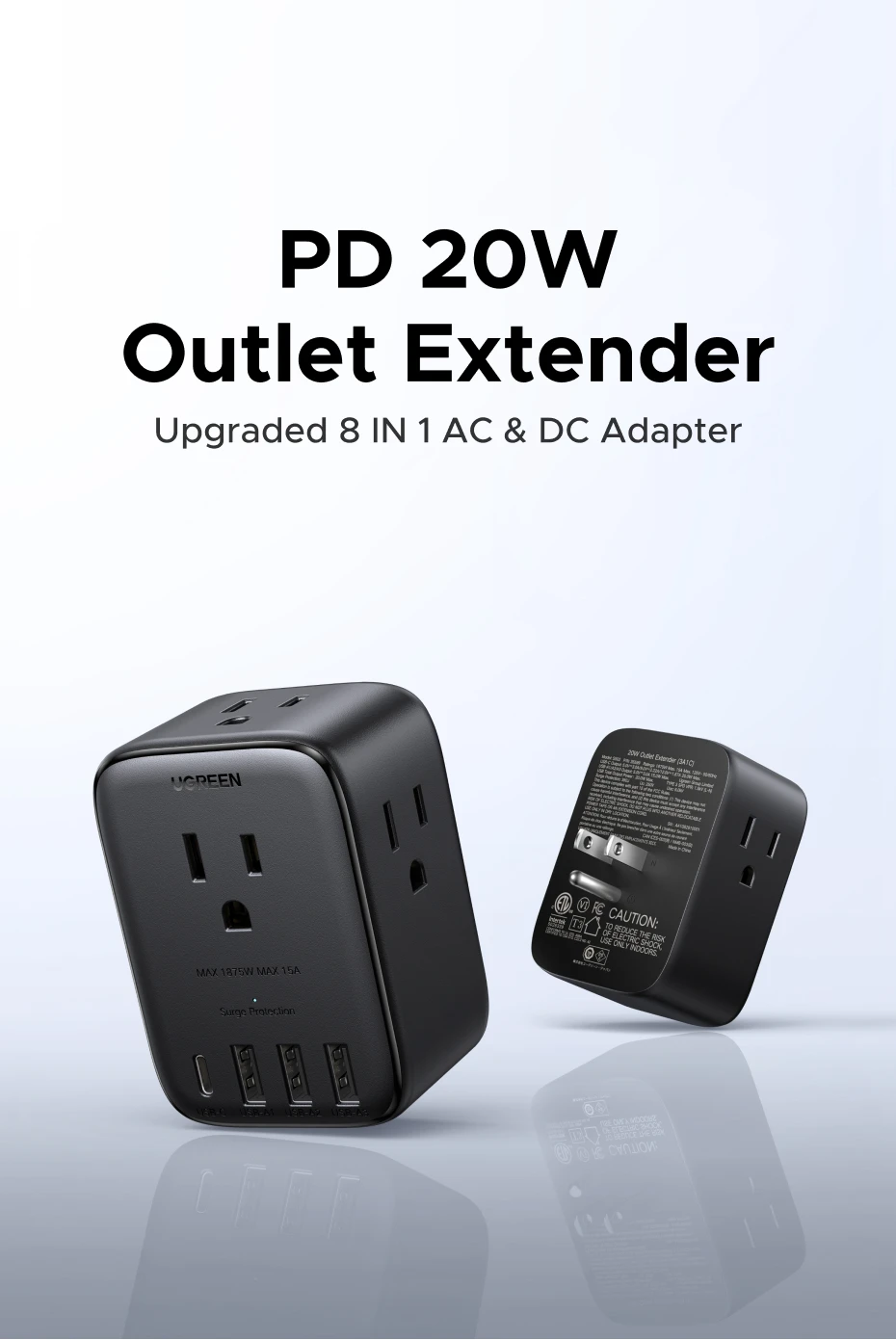 UGREEN Outlet Extender 20W Power Strip 4 AC Outlets 3 USB-A 1 USB-C Wall Charger for Home Office Travel 1875W 15A 125V