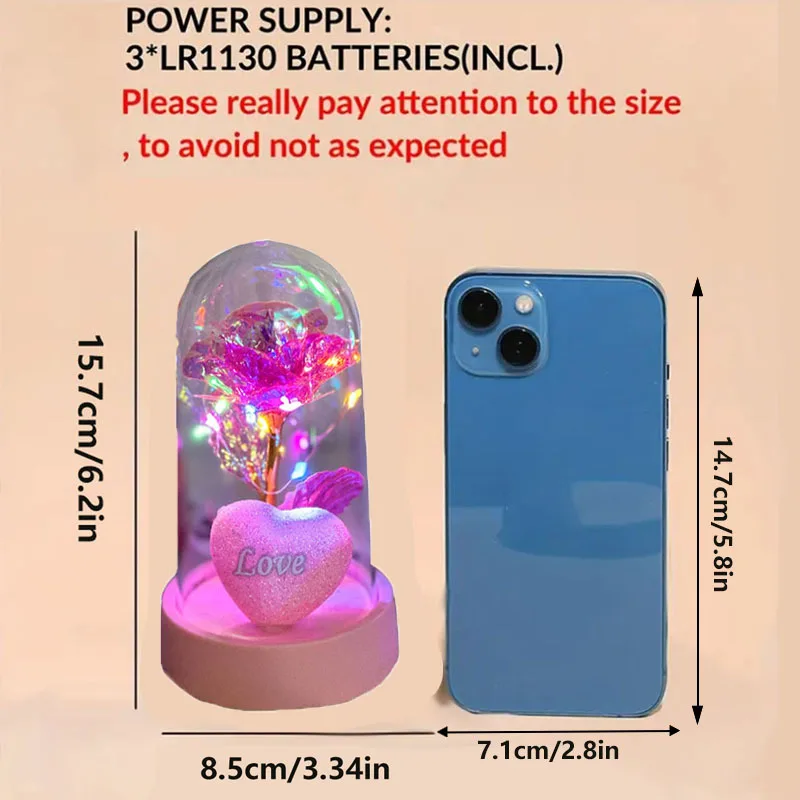 • Romantic LED rose under a clear plastic cover that softly glows to create a cozy, dreamy atmosphere in any room.